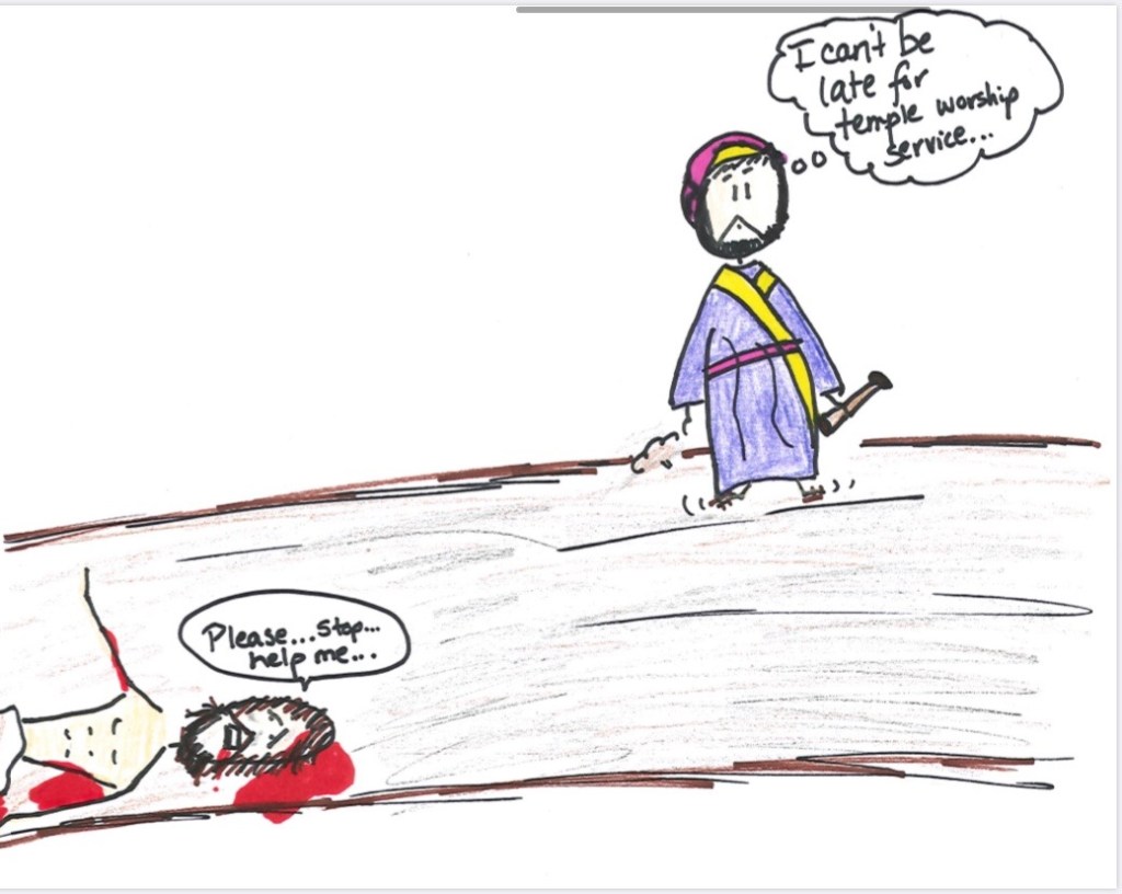 While the man lie there in terrible pain, a Jewish priest (a religious leader in the temple or church) came walking by. He saw the man and knew that he needed help, but instead of stopping to care for the man, he walked to the other side of the road and passed him by.
