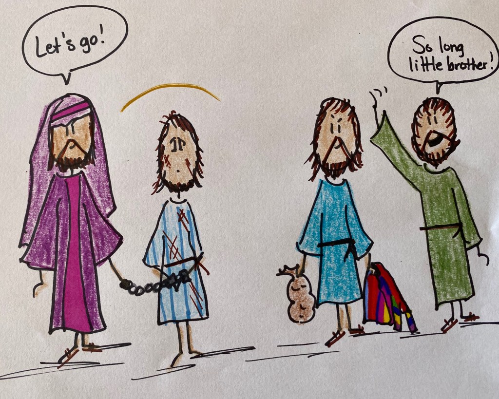 Joseph came from a very large family. He had 11 brothers. Joseph’s father loved Joseph the most and it made his brothers very jealous…so jealous that they captured him and sold him as a slave to get rid of him!